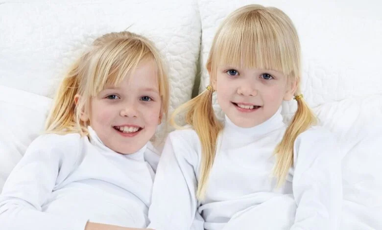 Due gemelle bionde di 5 anni sorridono mentre tengono in mano dei biglietti in salotto | Fonte: Midjourney