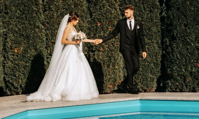 Una coppia di sposi in posa davanti a una piscina | Fonte: Midjourney