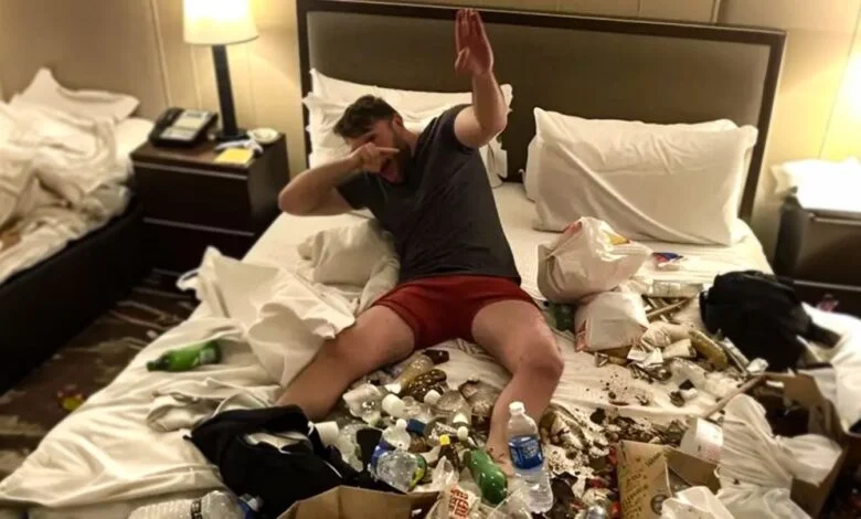 Un uomo compiaciuto in una stanza d’albergo | Fonte: Midjourney